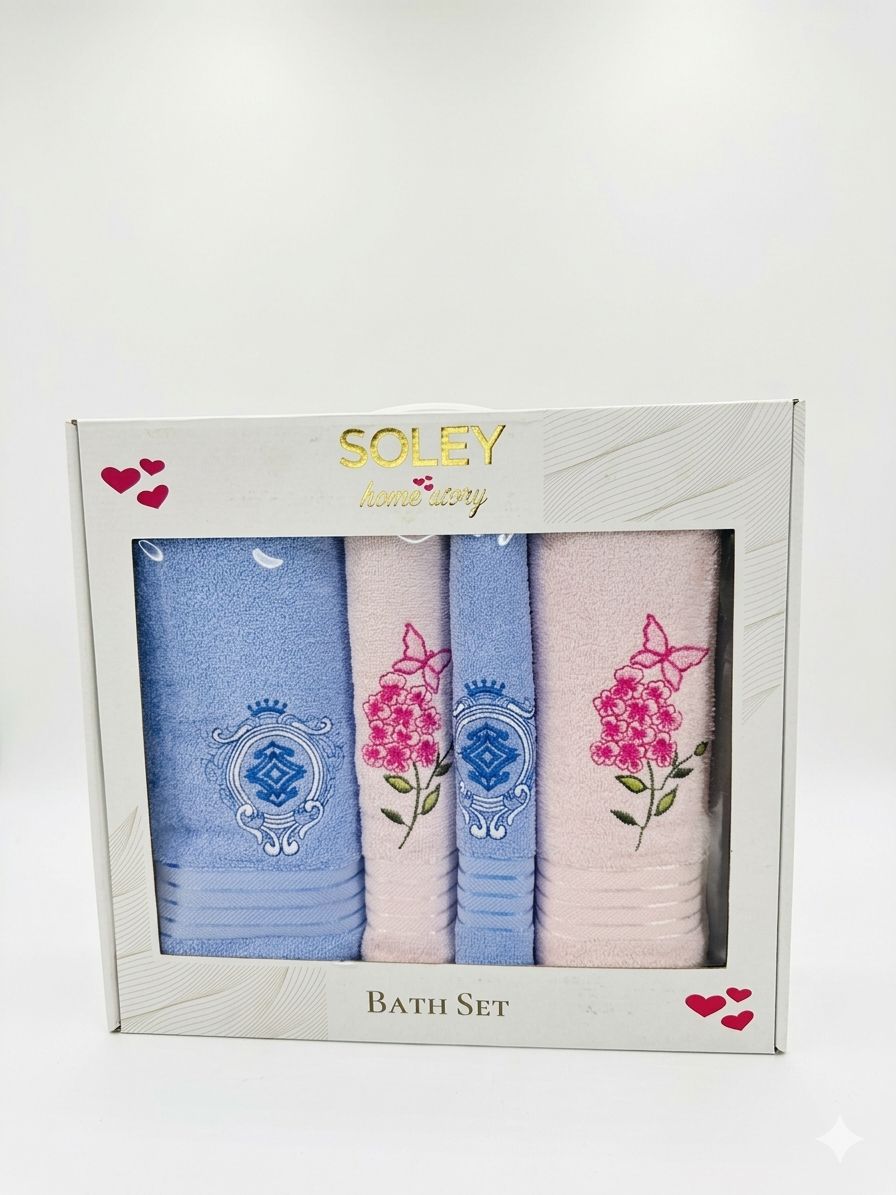 Ensemble 4 serviettes Hamam. Composition : 2 moyennes et 2 petites. Couleur bleu et rose pâle à motifs. Idéal pour la salle de bain, la plage ou le hammam.