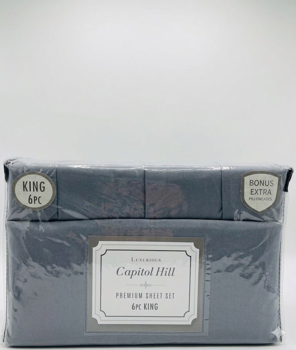 Drap de lit Capitol Hill – parure 6 pièces gris. Poche profonde adaptée aux matelas jusqu’à 40 cm. Composition : 1 drap plat, 1 drap-housse, 4 taies d’oreiller.