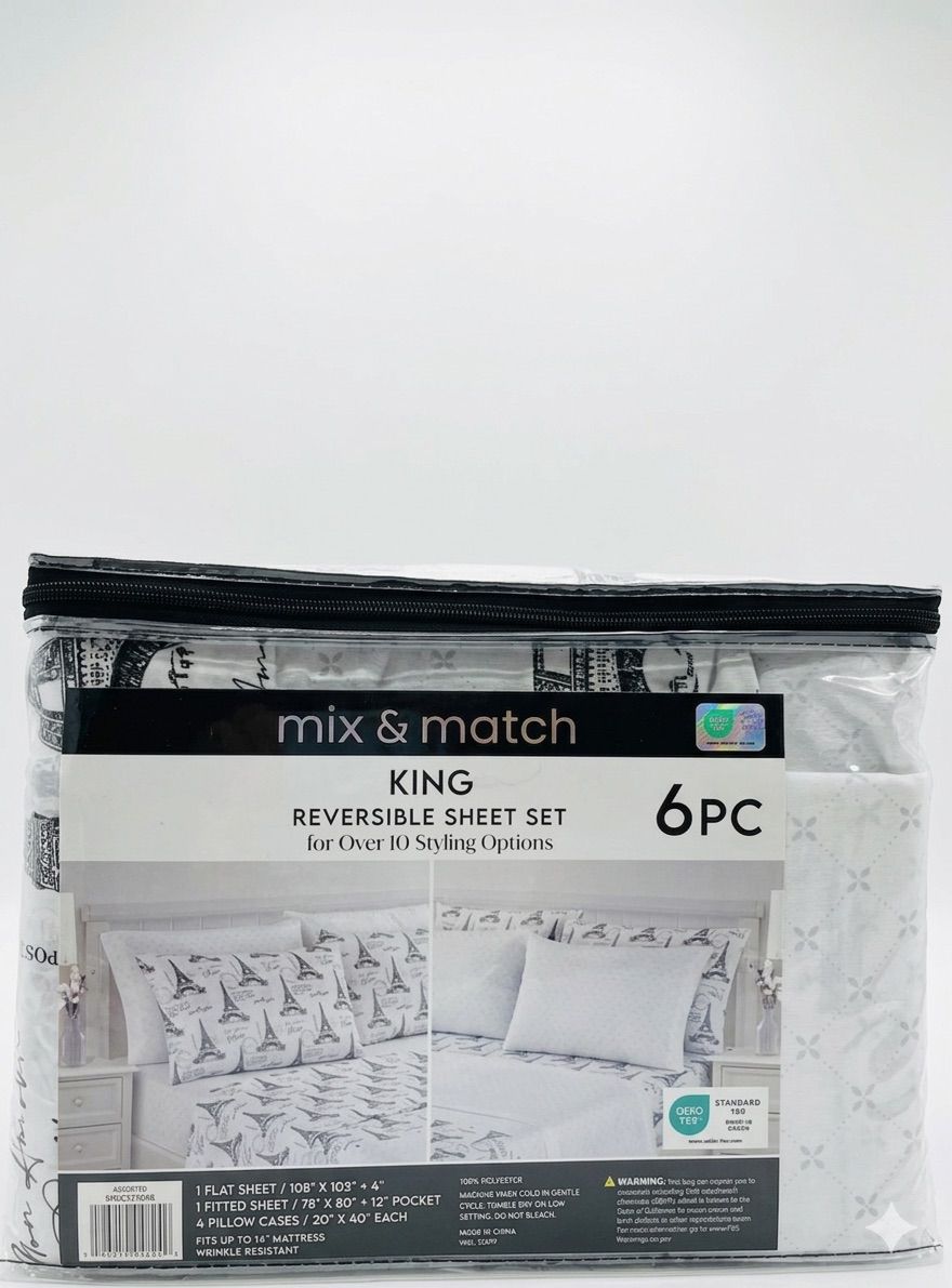 Drap de lit Mix match – parure 6 pièces. Blanc, noir et gris à motifs. Poche profonde adaptée aux matelas jusqu’à 40 cm. Composition : 1 drap plat, 1 drap-housse, 4 taies d’oreiller.