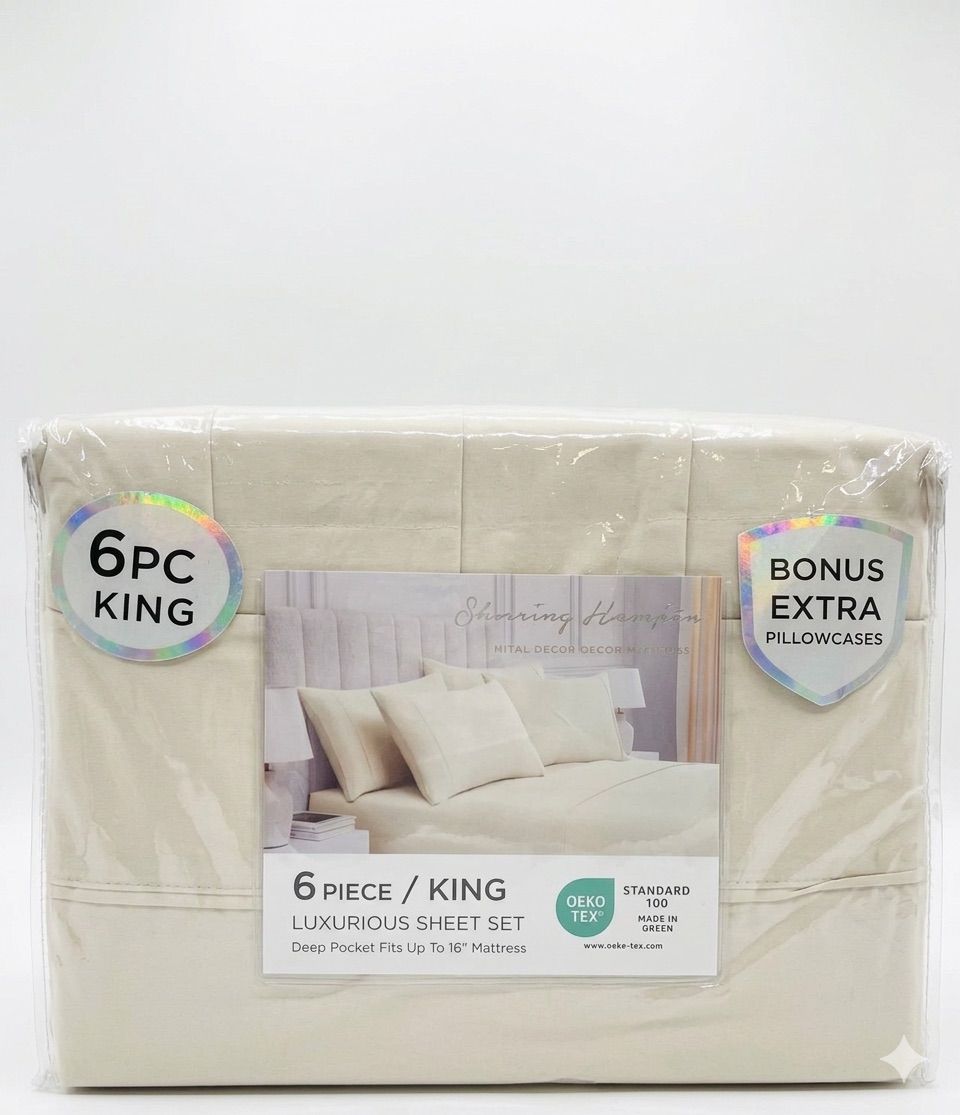 Drap de lit Sterling – parure 6 pièces beige. Poche profonde adaptée aux matelas jusqu’à 40 cm. Composition : 1 drap plat, 1 drap-housse, 4 taies d’oreiller.