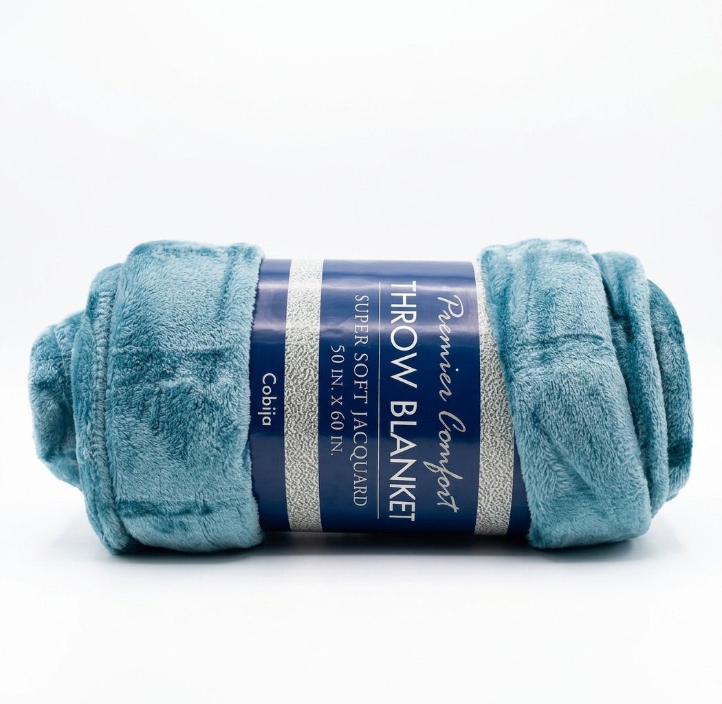 Plaid confort THROW en flanelle ultra douce. Couleur bleu azur, taille 127 x 152 cm. Idéal pour canapé, lit, décoration et moments cocooning. Design élégant et moderne.